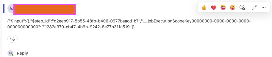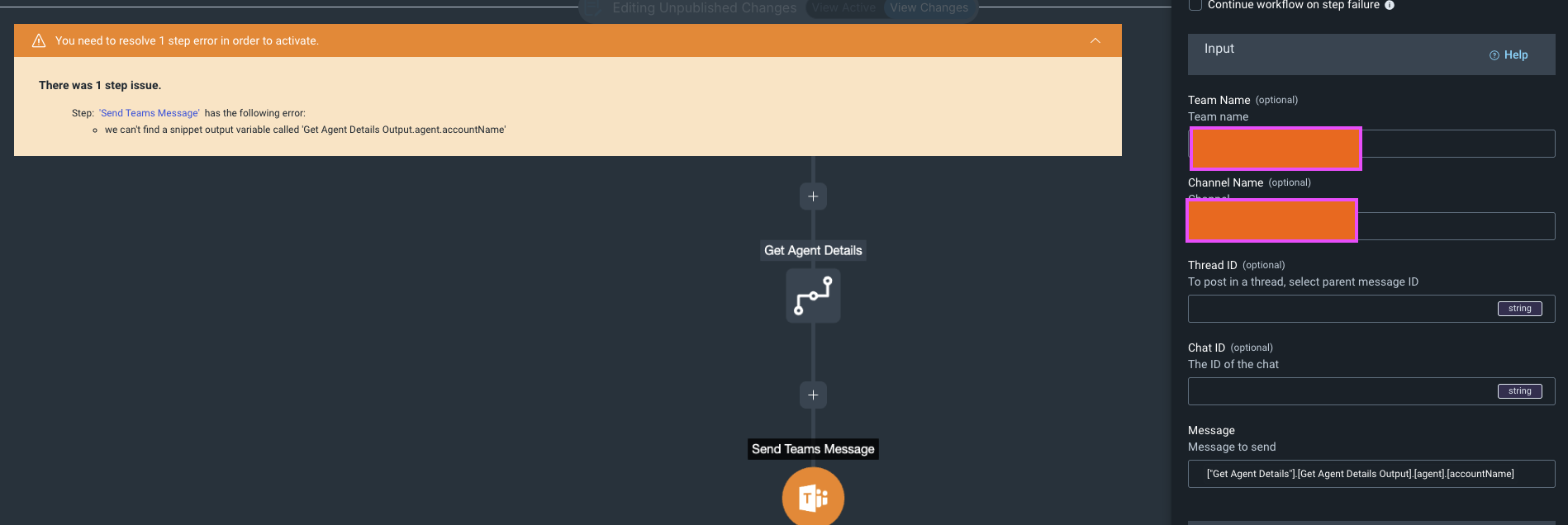 When you choose your Snippet step in your workflow you are asked to give it a name. That name will then give an object like every other step, but that object doesn’t contain any data about the actual execution occurring in the snippet. If I send it to a Teams Message as seen below, you can see that is not SentinelOne Agent Details.